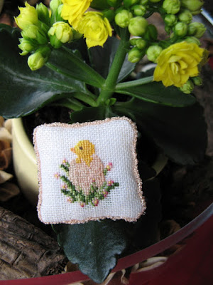 Rond de Paasdagen heb ik geborduurd aan dit lentekussentje. Een borduurpatroontje uit een boekje van DMC . Eerste paasdag was het borduren klaar. Tweede Paasdag heb ik het kussentje in elkaar genaaid en afgewerkt. Ik had dit borduurpatroontje al jaren in huis en elke keer dat ik het zag dacht ik: dit moet ik gebruiken voor een kussentje. Ik ben dus helemaal blij dat die wens nu is uitgekomen.